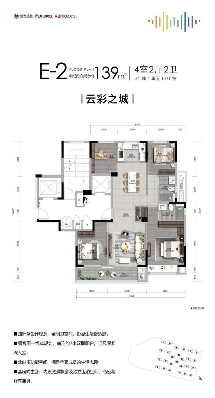 约139㎡户型点评:四叶草设计理念,全明卫空间,彰显生活舒适感,餐客厨一线式规划,南连约7米双联阳台,迎风景和煦入室,北向多功能空间,满足全家成员的生活志趣,套房式主卧,内设宽景飘窗及独立卫浴空间私密与舒享兼具