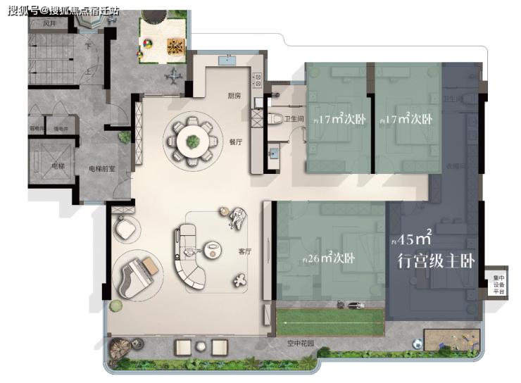强调庭院与室内空间的互通,南向连接的约18米空中花园,