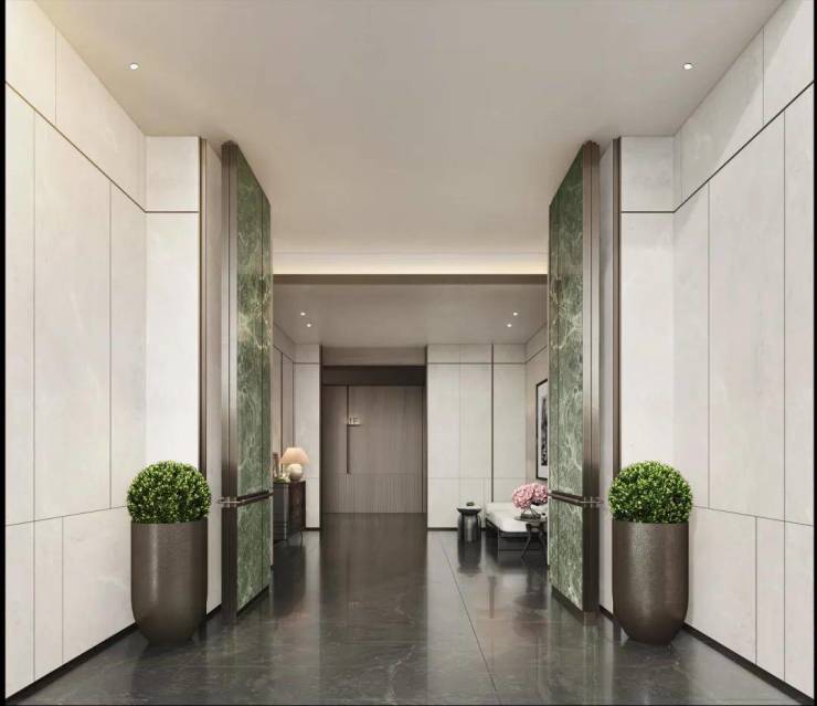 板块最气派的入户门头,总宽约42米,高约7米,五星级安曼酒店设计风格,板块唯一配置五星级酒店落客大堂,门头搭配两个百万油松,给业主最尊崇的入户体验。