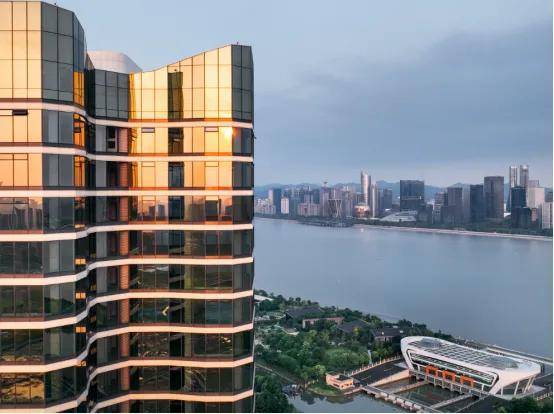 萧山明华誉港城的建筑立面以杭州市花—桂花花瓣为造型灵感,四瓣依次展开,以同频世界审美的曲线立面,融合鎏金玻璃幕墙,让建筑在钱塘江畔熠熠生辉,成为世纪城新地标。