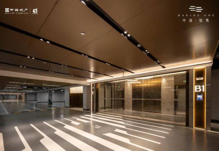 车道上方区域,采用格栅吊顶设计,优化了管线排布,提升颜值;人性化地下指示,一日了然,方便行车。