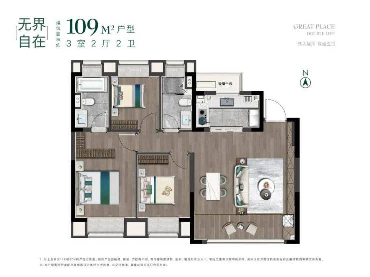 建面约109㎡,3室2厅2卫