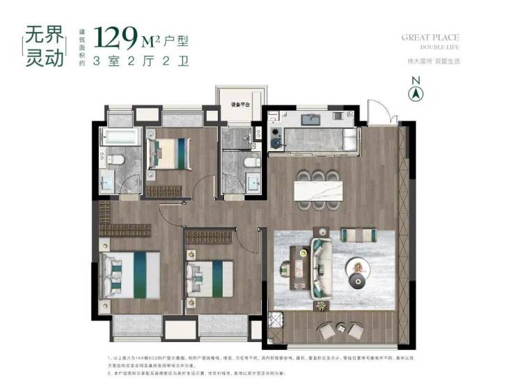 建面约129㎡,3室2厅2卫