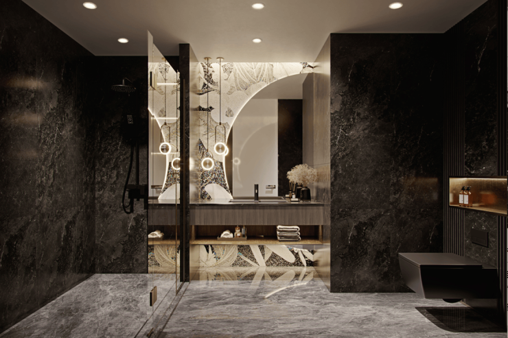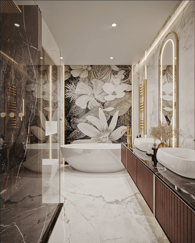 项目以奢装标准(6500元/㎡)交付,煤气入户,民用水电;配置华为智能生活,全屋中央空调、地暖、净水、新风系统;高配汉斯格雅、杜拉维特、西门子等一线品牌;精选纯天然石材,雕琢生活的每一寸空间。