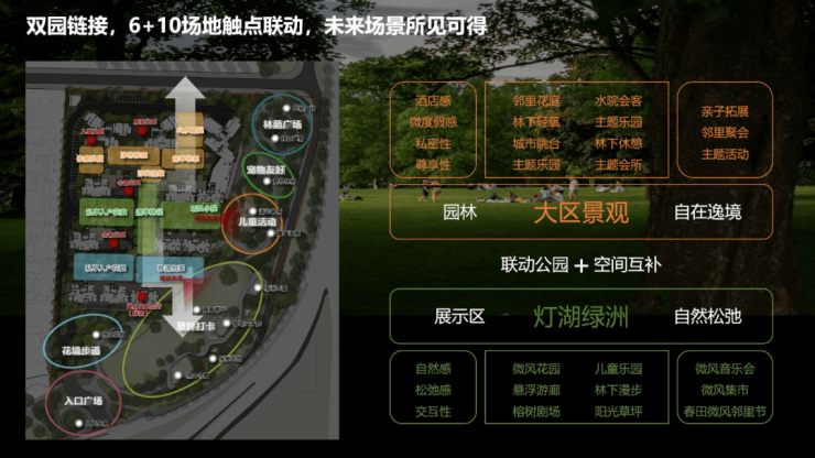 星汇灯湖景观设计提炼自在惬意的城市人文精神内核,以定制细节的酒店美学回应90、95后品质生活的需求,打造“两轴+三院+十大园居专属生活场景”,塑造自在隐逸生活秘境。同时链接内外双园,6+10场地触点联动,未来场景所见可得。