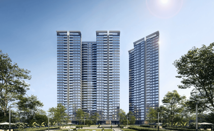 项目采用大面积玻璃幕墙打造现代公建化立面,0.38的极高窗地比,对比周边传统住宅,景观视野、通风采光整体提升55%。匠心独运的屋檐顶部设计,融入“展翅高飞”美学理念,水平舒展的线条也寓意居住于此,与万亿灯湖展翅腾飞。