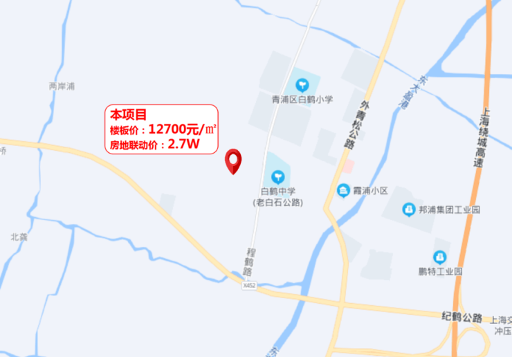 2021年6月21日,宝业集团以总价5.69亿元竞得青浦区白鹤镇白石路北侧30A-01A地块,成交楼面价12743元/平,溢价率8%,房地联动价2.7万/m²。