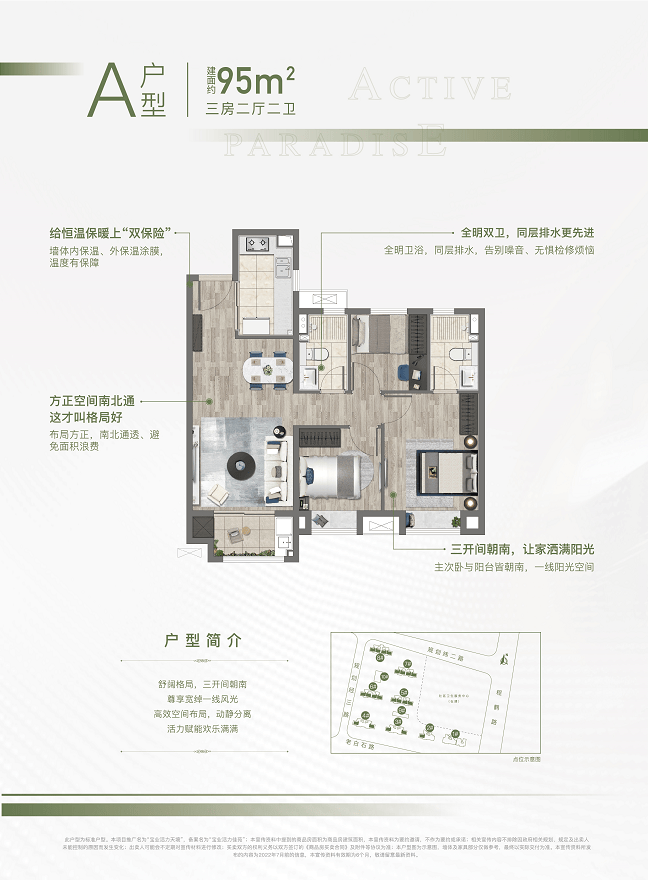 约95㎡的三房,南北通透,全明设计,三开间朝南,户型方正。