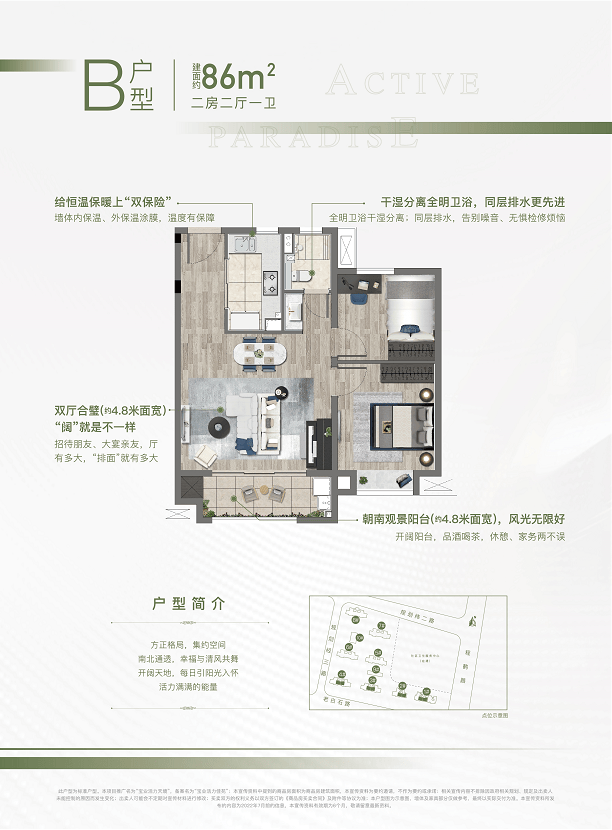约86㎡两房,全明户型设计,空间可观,南北通透,尺度开阔。