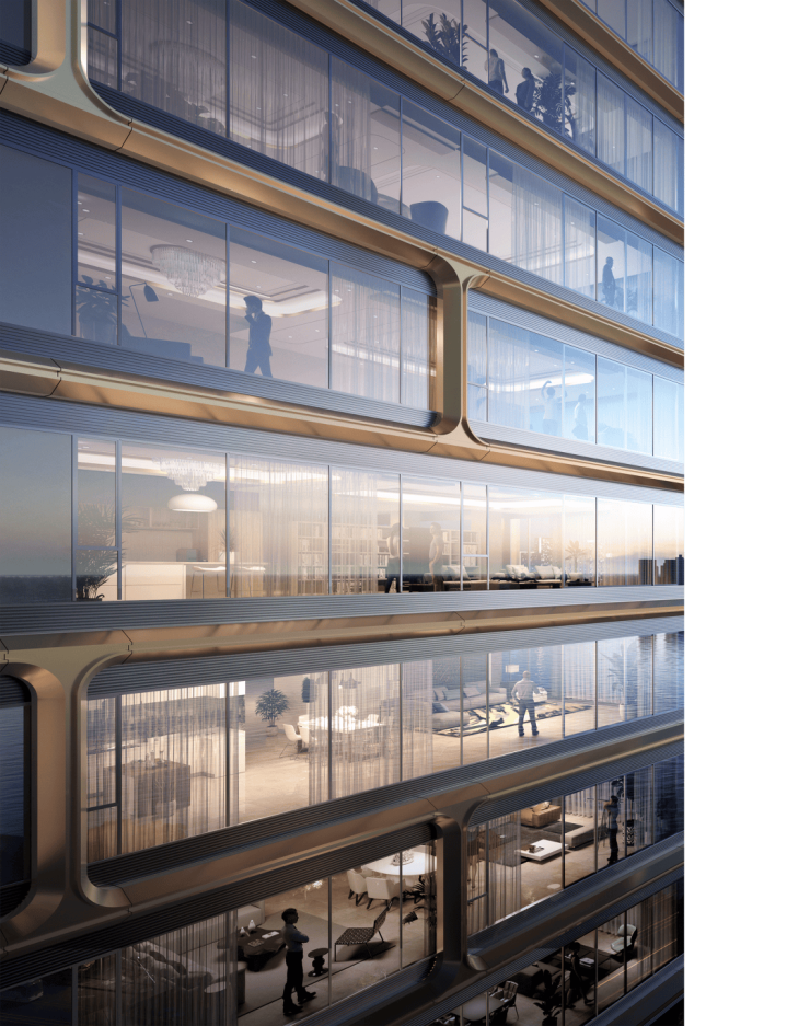 设计提取钱塘江水“潮涌”的动态元素,抽象为独特精美的金色铝板曲面线条,结合大面积的玻璃,勾勒建筑体量的层间关系,交织出极富韵律的纵向线条,以潮水般流动变化的独特气质屹立江岸,又融入钱塘潮水流淌奔涌的历史之中。