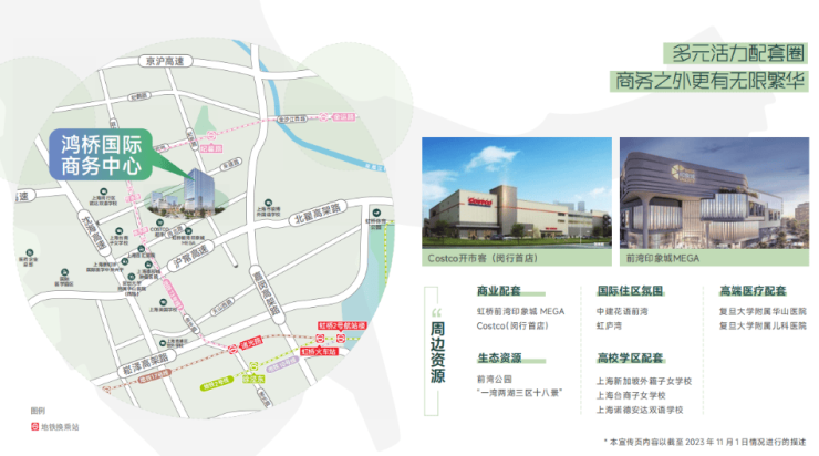 建筑面积30万㎡虹桥前湾高品质世界级会客厅 + 总部式高配置商务空间 +18万㎡虹桥枢纽高速率轨交体系 + 高能级商圈前湾印象城MEGA繁华生活 + 跨国内资、文创电竞等高端服务经济门户+ 高端医疗资源具备 + 著名国际设计团队联合打造