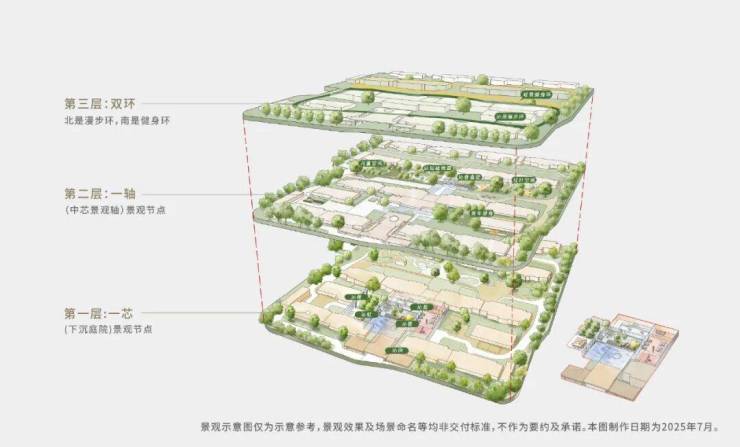 “立体景观芯”,下沉庭院复合型功能空间,非平面铺陈,目之所及皆是立体画境。