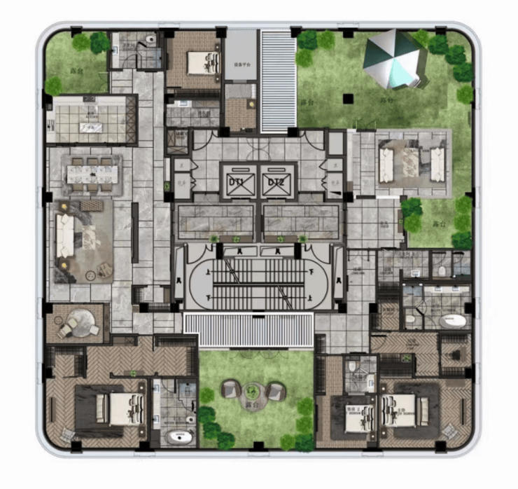 二楼带景观露台,顶楼空间则奢侈到夸张,490m²五房,一层一户送三个露台,比传统的300m²地上三层地下二层的别墅还舒服。因为别墅单层面积80m²,吃个饭楼上楼下跑,这里则是490m²摊在一个平面,因此这类顶楼大平层极度稀缺。