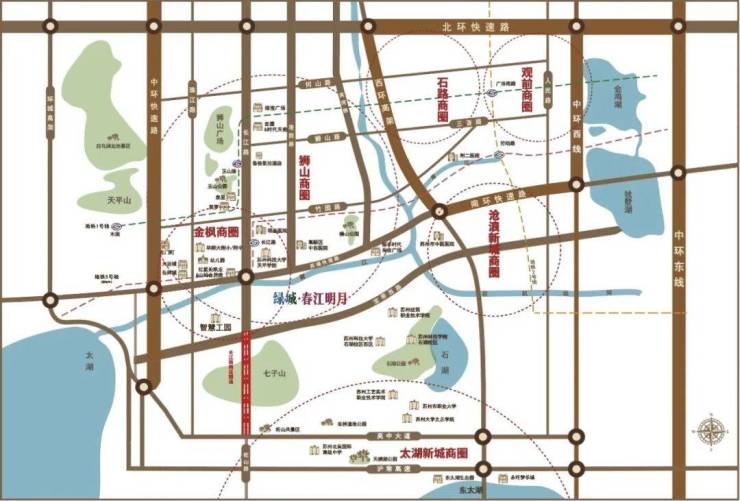 交通——长江路隧道穿越七子山及吴中大道后,通过旺山路与太湖隧道相连;项目紧邻苏福快速路与中环西线,便捷通达全城,近享地铁3号线,5号线,打造全方位多维交通体系,城心社交主场与理想生活主场自由切换。