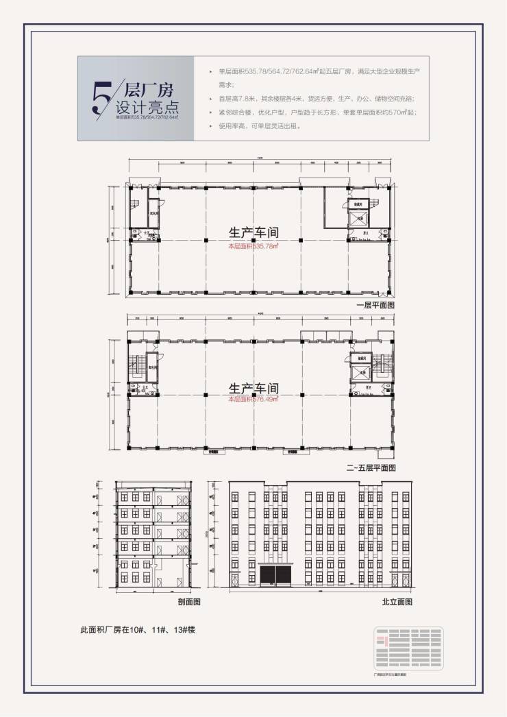 五层厂房:一层高 7.8米,二~五层层高 4 米