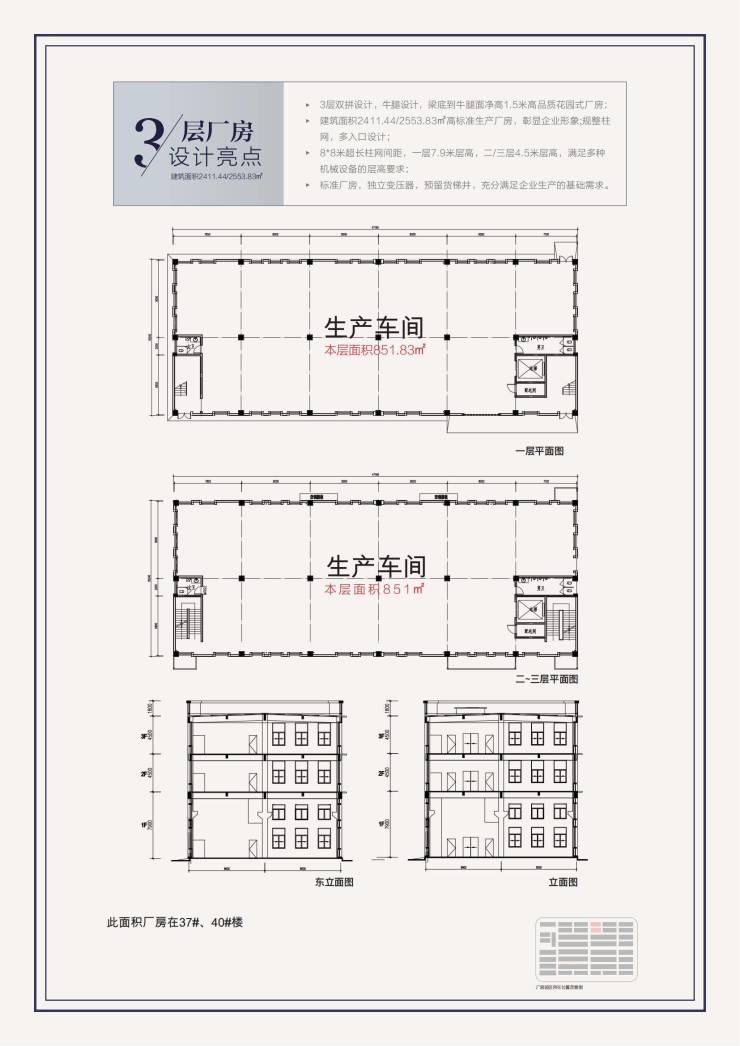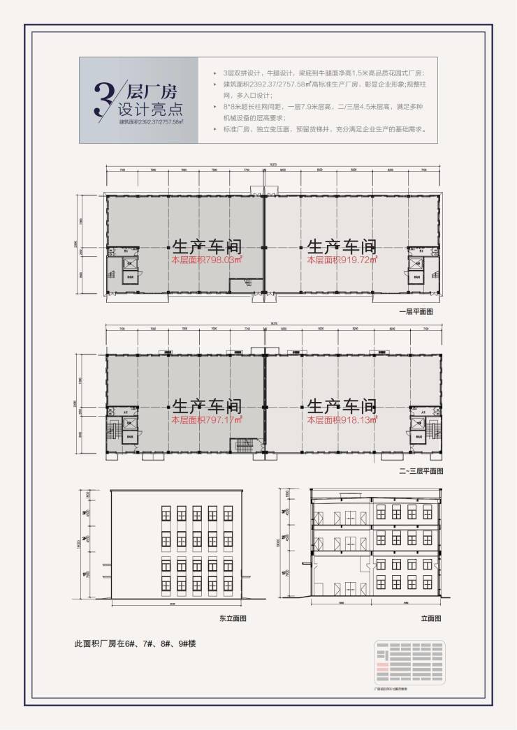 三层厂房:一层高7.9米,二层、三层高4.5米,预留牛腿,可安装 5t 电动单梁吊车