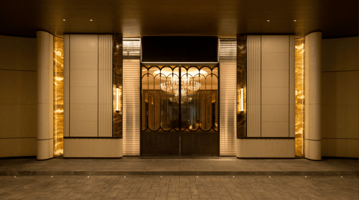 门庭延街的外立面,以精工定制弧形 贝金米黄大理石 为主调,镶嵌典藏级 老虎玉大理石 ,点缀 古铜色现代海派艺术感 灯器,整体呈现出百年海派的贵雅气质。