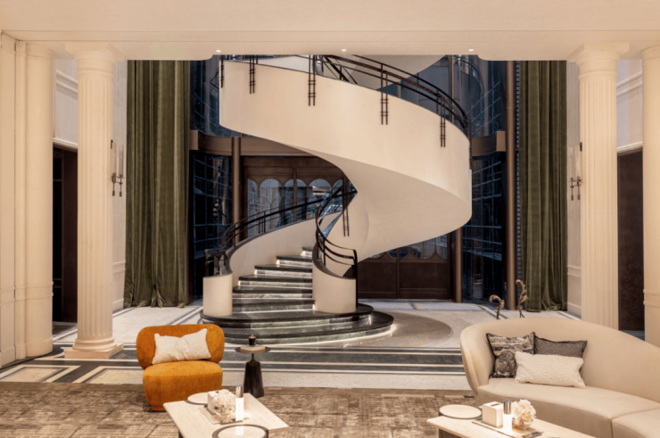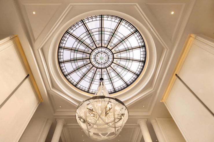 中庭大门设计为“海派光厅”,其玻璃镜面由匠人手工绘制经典海派线条,邬达克经典的纹路设计嵌于表面,同时墙面定制 优雅的奢石装饰 ,整个空间既奢华又富有底蕴。