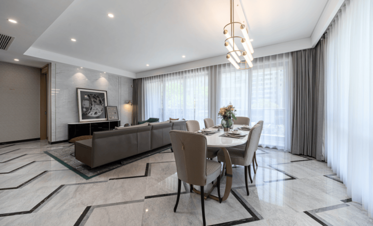 一层独立入户,南北通透客餐厅一体的起居空间,足以容纳一个大家庭的节日聚餐或是一场精致的下午茶party。