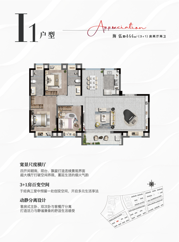 1、户型多元:该项目可满足市面客户一切需求,约110㎡-144㎡,刚需改善户型皆有;