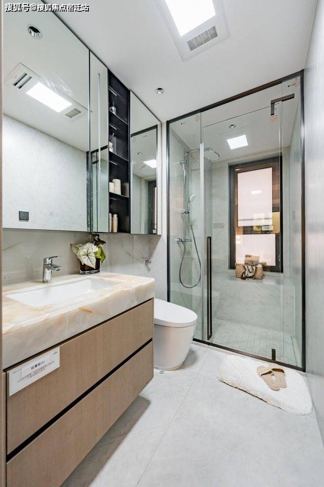 套房主卧卫浴间带天然奢石台面,诚意配置一体化金属包边美学镜柜(包含美妆冰箱/门板收纳架/轨道式置物架等,镜柜附带线控/触控镜面灯光+镜面除雾),兼具风暖浴霸、恒温顶喷花洒、双下水隐形地漏等人性化细节。另外,主客卫皆甄选知名品牌智能马桶,为现代化都会生活赋予更多品质享受。