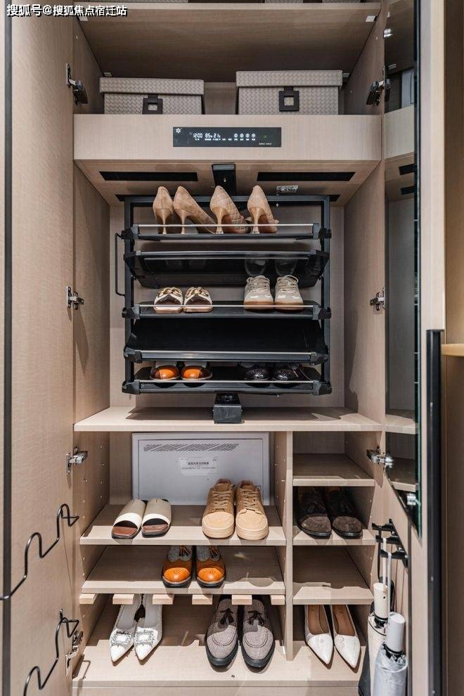 钢木复合入户门隔绝外界喧扰,品牌智能门锁多种方式便捷归家。美观实用的玄关柜内含旋转鞋架/消毒精灵等多功能设置,搭配精致金属壁龛,带来别具一格的空间观感。