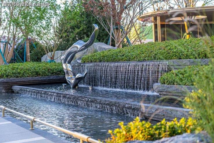 精致的水系景观勾勒点缀与中庭园林中,增添一丝别样的灵动,一朵“万象之镜”的浪花雕塑,与叠山理水相映成趣,携着美好的祝福,吟咏着生活的颂歌。