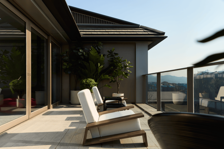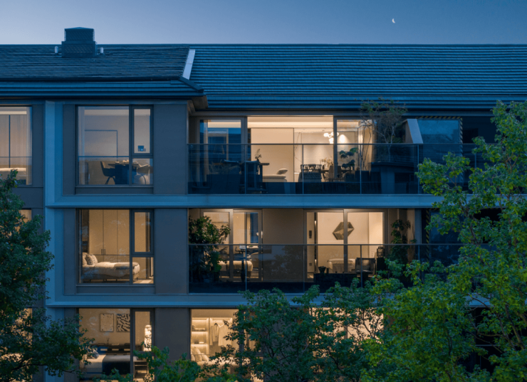 建筑坡顶采用大坡顶与小坡顶结合,屋面采用瓦片材质与金属钩边进行铺装,青瓦交叠,如远山淡墨。立面局部采用仿石铝板进行装点,在檐下空间与建筑装饰上,点缀了橡木灰金属材质,形成克制且奢华的冲突美。