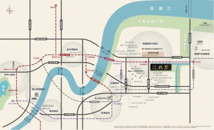 咫尺地铁8号线(新湾路站距本案约700m)、近邻地铁7号线,双流驰骋。地铁一站直达钱塘高铁站(规划)。高速路、快速路四通八达,与杭州萧山国际机场、公路物流和信息产业枢纽互通,“五港合一”内外畅达。