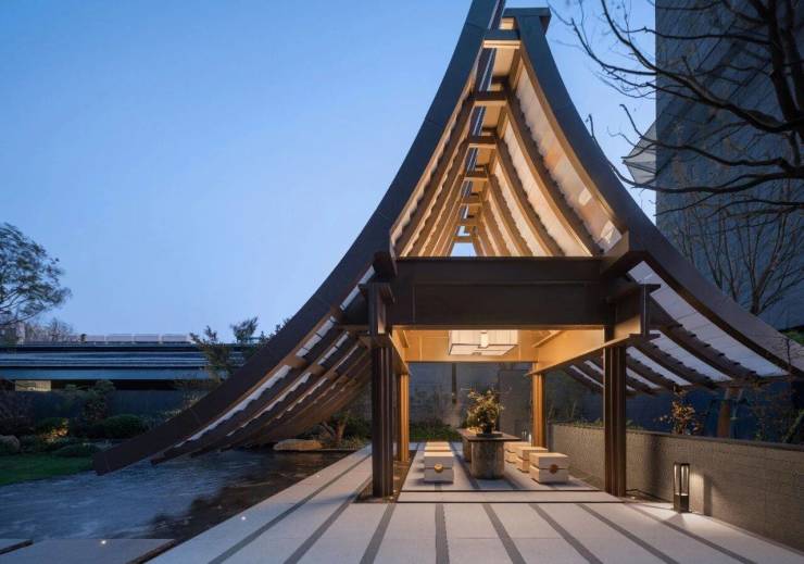 沿着青年路,用近60m超长建筑延展面,约40.8米长檐口屋顶,采用横向延展的设计,形成社区主入口的恢弘气势界面尺度。开口近14m的檐下空间,打造空间的流动与视线的变化,营造归家礼序感。