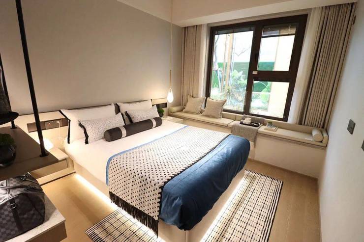 主卧套房设计,隐私性较好,飘窗设计更有效延申室内空间,也可以作为休闲区域使用,收纳空间设计的也比较充足,切实考虑年轻人买买买的购物习惯。
