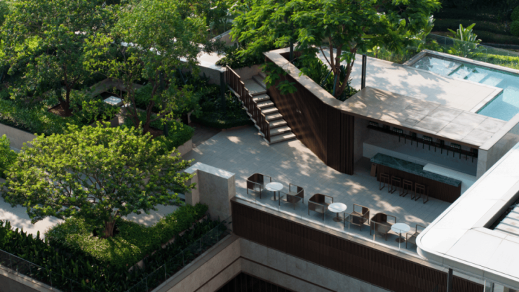 『中海·荔府』希望带来一种酒店式的充满品质感的度假感受。因为会所的标高复杂,所以屋顶花园的功能空间,会根据实际条件布置来平衡高差,从而带来更丰富有趣的游园体验。