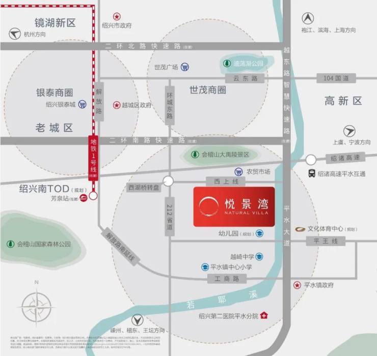 解放路南延:至平水镇工商路,距悦景湾约2公里,沿解放路直达绍兴地铁1号线芳泉站TOD(规划),6站地铁可到银泰城,瞬达镜湖、柯桥,通达杭州。
