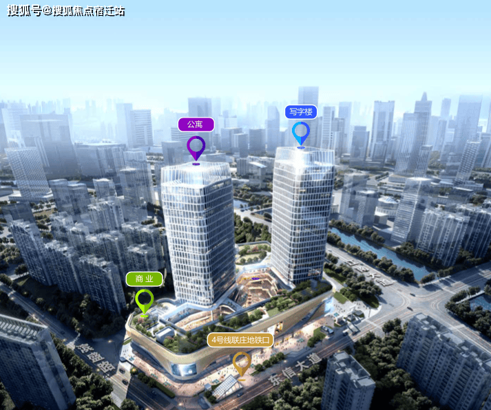 由两栋塔楼和一组裙楼组成,2-3楼是商场自持商业。独特的设计概念塔楼造型以水的流动变化为主题,通过造型的收分、挤压变化形成独具特色、灵动舒展的塔楼造型。整体建筑为框架核心筒装配式楼盖结构,塔楼的圆角造型使其从周围矩形建筑中脱颖而出,外立面以蓝灰色中空low-E玻璃和浅灰色铝板组成,凸显时尚、大气、高级。