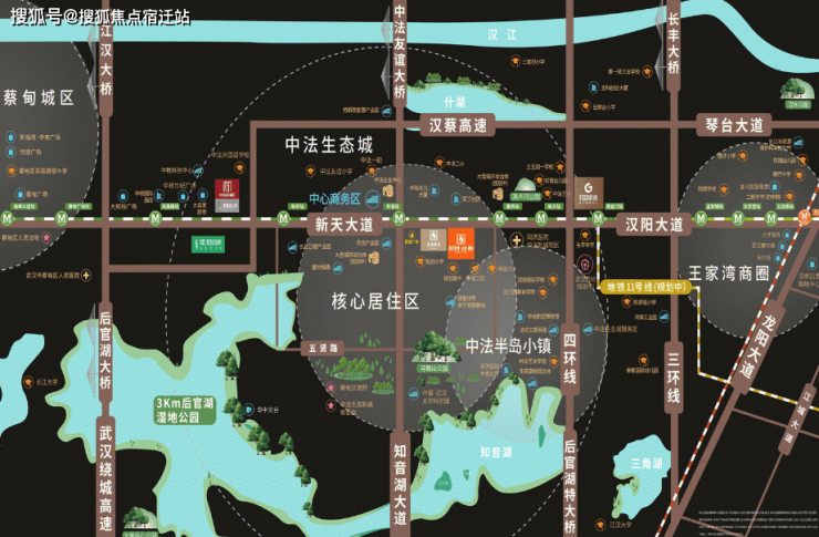 商业配套:项目A、B、G地块均包含部分临街商业。附近有在建的蔡甸吾悦广场,体量约10万方,直线距离仅500多米。其次就是蔡甸城区的中核世纪广场和周边的小区底商。王家湾商圈距离超过10公里,但出行比较便捷也算是较为方便的配套。
