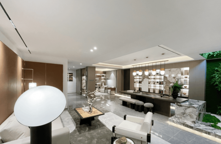 从以上就能看出项目是奔着高端改善去的,为了营造更纯粹的氛围,还有更多的升级之处。外立面用材主打石材干挂(干挂石材价格昂贵,高档大气,足以对其他普通材料立面的项目带来降维打击),木纹铝板,以及三玻两腔low-e中空玻璃,驱车路过看一眼就会觉得非常高级。