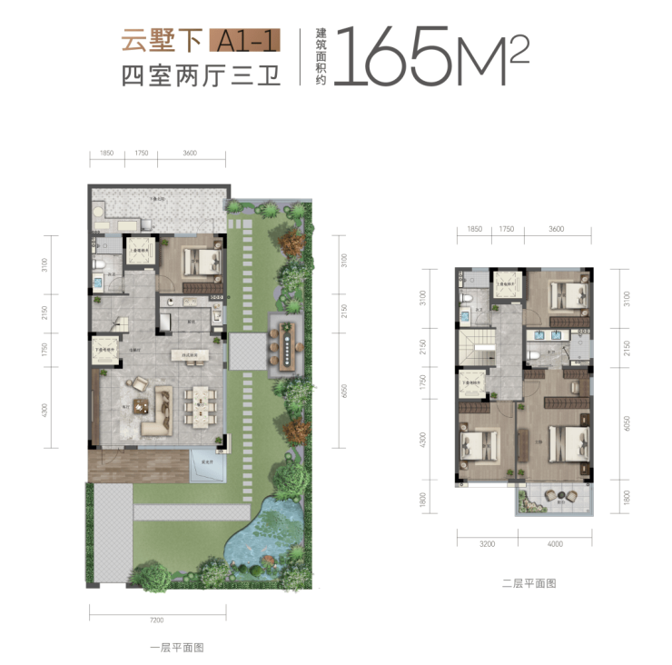 云檐里150-184m²户型全部为四房两厅三卫设计,地暖空调一应俱全,还有超大面积的私家花园。以约168m²下叠边套为例,约100+m²的私享花园庭院,以270°环绕的排布,让生活与自然融为一体。