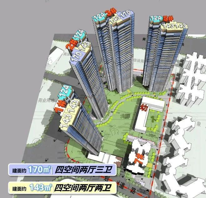 项目占地面积24992平方,共建了4栋住宅,两梯三户,1栋40层,2-3栋44层,5栋41层,目前主要在售户型:124、143、170平四房。