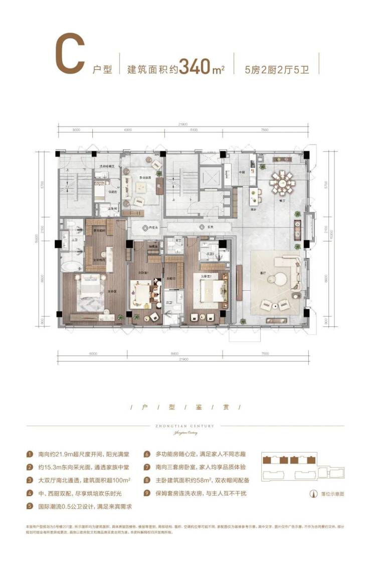 和市面上的其他宽景平层不同,HCC中天纪并没有在300多方的空间里规划出5-6个房间,而是保留了约100方空间作为公共社交空间,完全满足了商务、办公、居住等多重需求。由于公共社交空间被扩大了,因而整个房间的视野和采光面就被大大拓宽了。以C户型为例,四开间朝南,南向的总开间有近22米,西面还有15米的采光面。