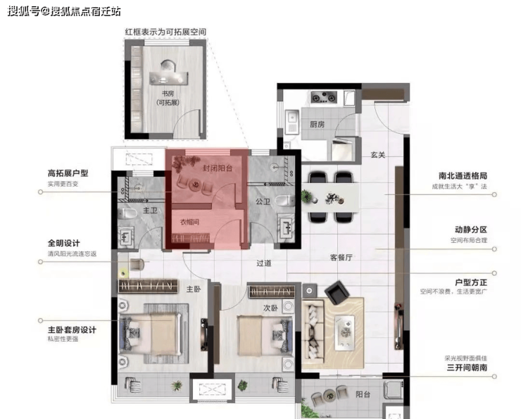 户型方正、南北通透的设计、四开间朝南提升空间的采光度和通风性;