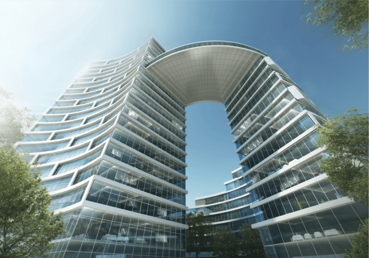 两栋写字楼建筑风格均为现代极简,采用大面LOW-E玻璃幕墙,匹以铝板线条装饰,并依循国家绿色建筑设计三星标准营建,致力于营造性能与颜值兼具的高品位商务封面。
