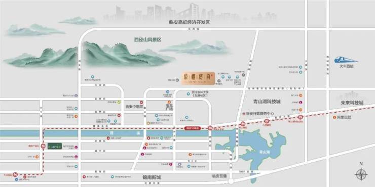 杭临快速路-留祥路西延快速路(规划)、临安南北高光主轴-农林大路、地铁16号线-农林大学站、青山湖站、青山湖隧道速达临安互通等,纵横路网,顺达全城。
