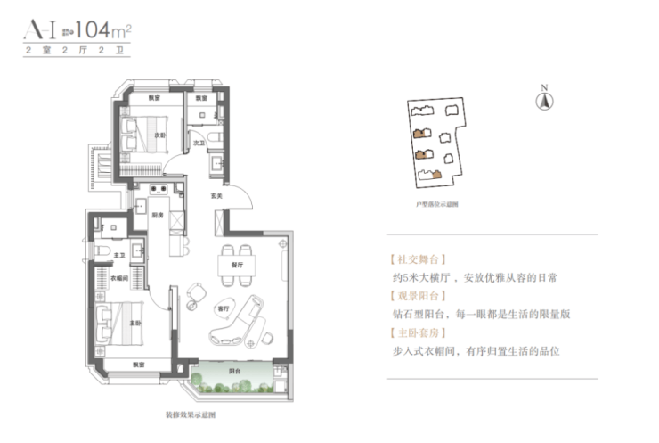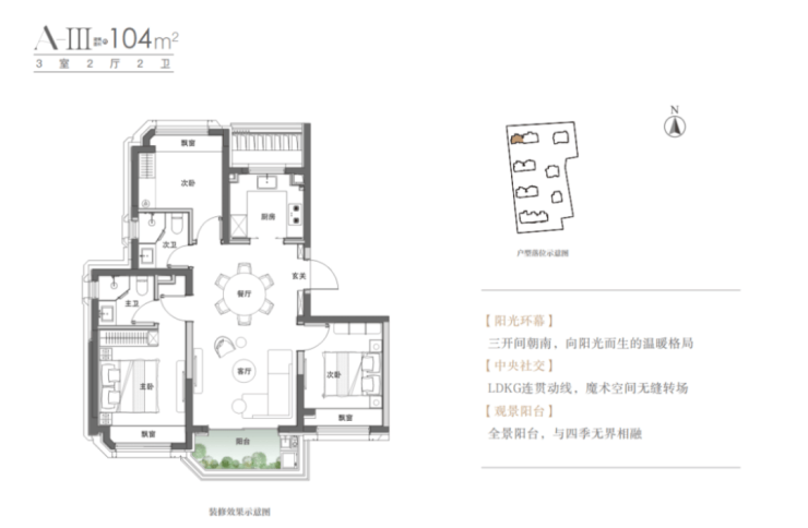 建面约104㎡的两房两厅两卫是舒适的大两房设计,主要分布于小区西侧和头排,视野相当出众。