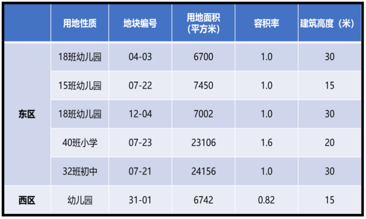 东区和西区最大的不同在于教育和公建设施配套,东区人口更密集,有5幅教育用地,从幼儿园至初中;而西区仅有1幅教育用地,作为幼儿园。