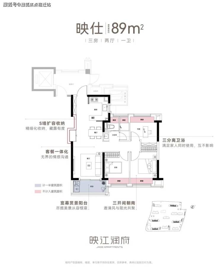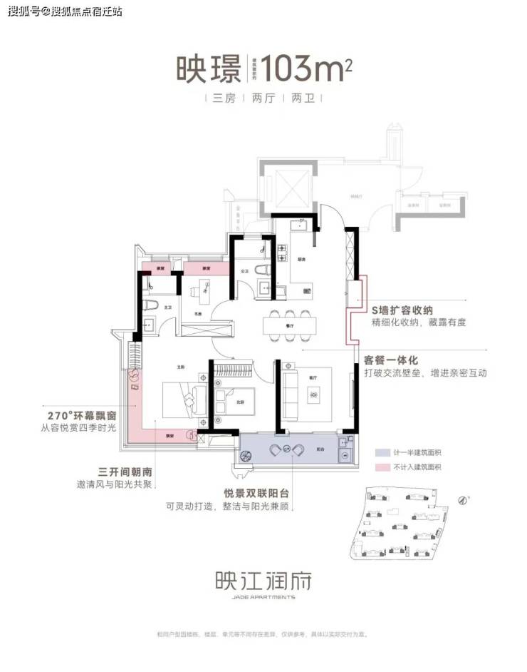 亮点一:270度环幕飘窗,通透主卧套房,对于卧室而言,常规的尺度延扩,不足以称为迭新。映江润府,103边套户型,引入了千万级以上豪宅之中才能够拥有的270度环幕飘窗设计,实现了极致的采光和观景体验。