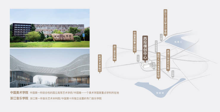 艺术配套:3公里范围内,拥有中国美术学院象山校区、浙江音乐学院、西湖大学研究院、浙大城市学院、国科大杭州高等研究院等,高校教育资源丰富,人才云集。