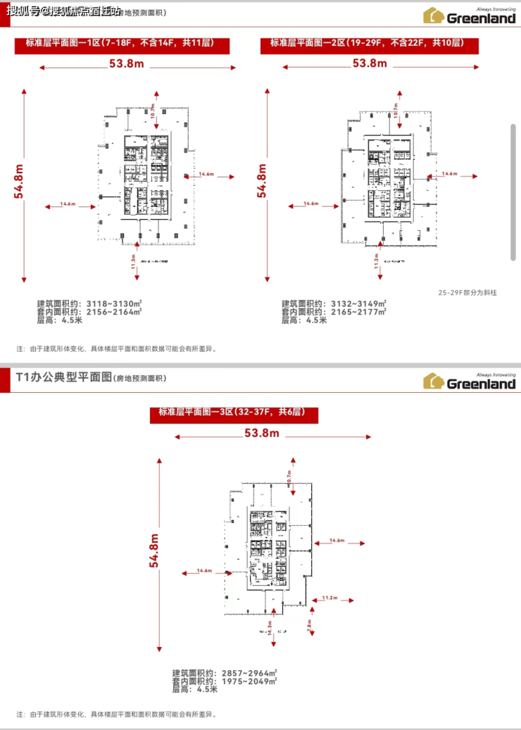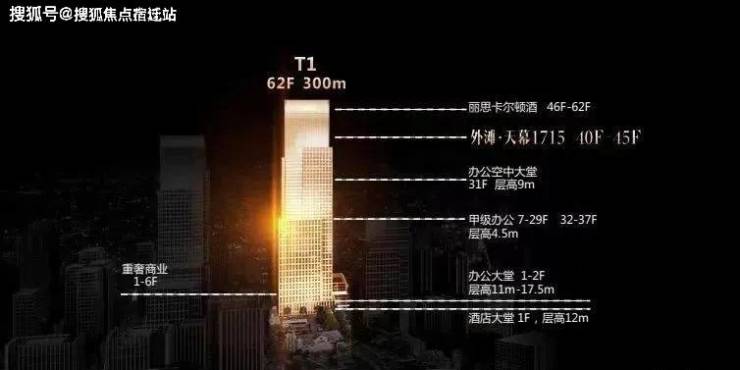 T1 -300米超高层塔楼上部46-62层为五星级酒店(丽思卡尔顿)、38,40-45层行政公馆,中部7-37层为甲级办公,底部为商业及大堂。