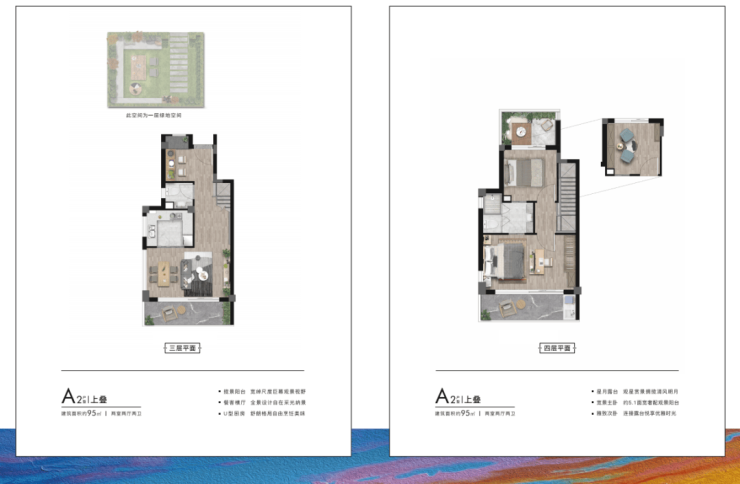 项目户型方面,面积段有两种——建面约95㎡下叠、上叠;建面约150㎡下叠、上叠。