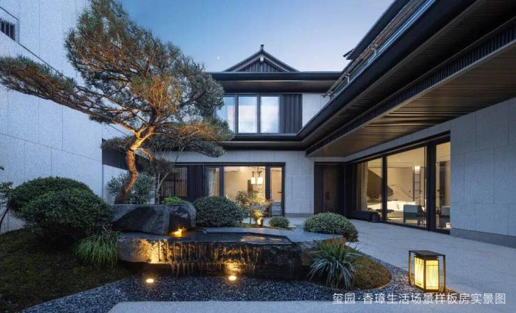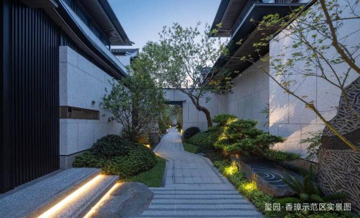 玺园·香璋景观由绿城环境宋淑华设计,以浙派园林风格为基底,汲取《溪山行旅图》《西园雅集图》灵感,以宋代长流涧串联整个景观轴线,并以绿植、景石等风景要素点缀,给人“如在画中游”的情景体验。
