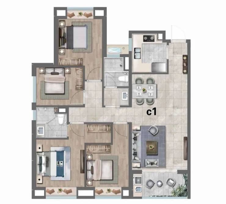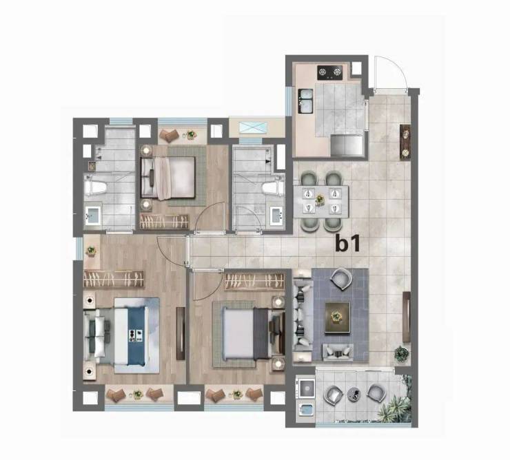 其中,建面约104㎡三房两厅两卫 ,三开间朝南+全卧室带飘窗+动静分离+南北通透+主卧套房设计,功能性和空间感完美结合,采光面非常足。